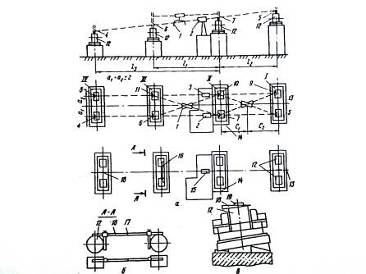 На рисунке 2 а, показаны наиболее благоприятные условия работы кранов при монтаже аппаратов на любую высоту в пределах характеристики кранов. На рисунке 2 о, показан монтаж, когда установка одного из спаренных кранов с внешней стороны фундаментов невозможна. В этих случаях монтаж аппаратов производится только маневрированием стрелы крана. На рисунке 2 в, показан подъём аппаратов при невозможности расположения кранов с внешней стороны фундаментов и проезда между фундаментами. В этом случае монтаж аппаратов производится за счёт увеличения вылета стрелы кранов или перемещения кранов с поднятым аппаратом в пределах грузовой характеристики кранов.