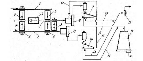 1, 2, 3 - конвейеры для отходов, 4 - колун, 5 - поперечные конвейеры, 6 - сбрасыватели, 7, 8 -дисковые рубительные машины; 9, 10 - гирационные сортировки для щепы, 11 - конвейер для кондиционной щепы, 12 - конвейер для крупной фракции, 13 - конвейер для мелкой фракции, 14 - бункер-накопитель кондиционной щепы, 15 - пневмоустановка для некондиционной фракции.