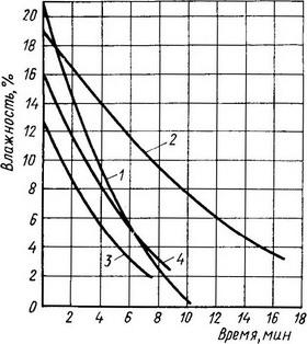Рис. 62. Изменение влажности при одностадийной сушке на гипсовых формах фаянсовых (1) и фарфоровых (2) тарелок и при двухстадийной сушке фаянсовых (3) и фарфоровых (4) тарелок