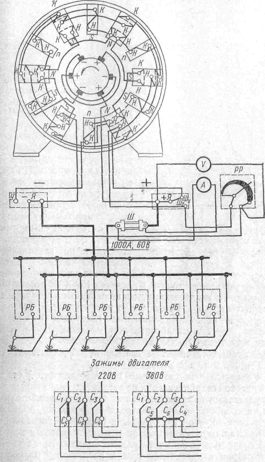 Зварювальний струм в генераторах цієї системи регулюється реостатами P і секціонуванням послідовної обмотки, тобто зміною числа ампер-витків.