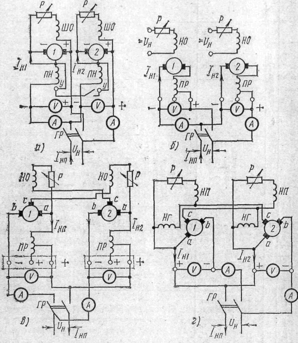 Мал. 7. Схема включення зварювальних генераторів на паралельну роботу: а — багатопостових, б — однопостових з незалежним збудженням і що послідовною розмагнічує обмотками, в — однопостових з паралельною намагнічуючою і послідовною розмагнічуючою обмотками|, г — однопостових з розщепленими полюсами; ШО — шунтова обмотка, ПН| — що послідовна намагнічує, НО — намагнічуюча обмотка, НП| — намагнічуюча поперечних полюсів, ПР— послідовна розмагнічуюча, НГ| — намагнічуюча головних полюсів, P — реостат, ГР — груповий рубильник, V — вольтметр, А — амперметр. І>Н1>, І>Н2>— струми навантаження окремих генераторів І>НП>— струм навантаження при паралельному включенні , U>н>| — напруга холостого ходу при паралельному включенні