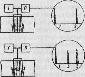 Відбившись від нижньої поверхні виробу, ультразвук вернеться, буде прийнятий датчиком, перетворений в електричні коливання й поданий на екран електронно-променевої трубки. При наявності дефектів ультразвукові коливання спотворяться: це буде видно на екрані електронно-променевої трубки, де з'явиться сплеск - перекручування. По характеру й розмірам перекручувань визначають види й розміри дефектів.