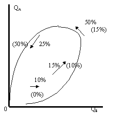 На рисунке 2 изображена типичная петля распределения товаров, которые не являются предметами повседневного спроса (надеюсь, читатель согласится, что таких товаров - большинство). В зависимости от дохода потребителей объемы потребления этих двух товаров меняются. При незначительных доходах и при очень высоких доходах (сверхвысоких) эти объемы потребления равны нулю. При средних доходах пропорции их потребления также меняются с изменением величин этих доходов.