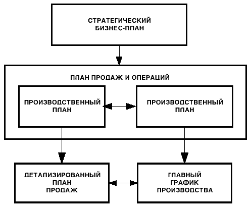 Основываясь на маркетинговом плане и сведениях об имеющихся ресурсах, производственный план устанавливает ограничения или уровни производственной деятельности на тот или иной момент в будущем. Он интегрирует возможности и производительность предприятия с маркетинговым и финансовым планами для достижения общих целей компании в бизнесе. Производственный план устанавливает общие уровни производства и материально-производственных запасов на соответствующий горизонту планирования срок. Первоочередная цель заключается в том, чтобы определить нормы производства, которые позволят выполнить поставленные в стратегическом бизнес-плане задачи. К ним относятся уровни материально-производственных запасов, портфель заказов (невыполненные заказы клиентов), рыночный спрос, обслуживание клиентов, недорогая эксплуатация оборудования, трудовые отношения и так далее. План должен охватывать достаточно продолжительный период, чтобы предусмотреть, какие трудовые ресурсы, оборудование, производственные мощности и материалы потребуются для его выполнения. Обычно этот период составляет от 6 до 18 месяцев и разбивается по месяцам, а иногда по неделям. В процессе планирования на этом уровне не учитываются такие детали, как отдельные изделия, цвета, фасоны или опции. Так как рассматривается длительный промежуток времени, и с уверенностью прогнозировать спрос на такой срок невозможно, подобная детализация была бы неточной и бесполезной, а разработка плана обходилась бы слишком дорого. Для планирования требуется лишь общая единица продукции или несколько групп изделий.