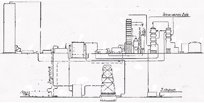 На установке используют пар высокого давления (14ати) с температурой 250°С, пар низкого давления (около 1атм) после турбин газодувок и пар, получаемый в испарителях. Для испарения поступающего в испаритель из напорного бака конденсата используется тепло, выделяющееся при охлаждении и конденсации проходящих в межтрубном пространстве паров воды и бензольных углеводородов. Температура последних большую часть времени отгонки их из угля лежит ниже 100° С, поэтому к испарителю подключен эжектор, работающий на паре высокого давления, который создает в нем необходимый для испарения воды вакуум.