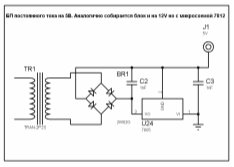 Не лишним будет привести и схему блока питания на 5В (на 12 делается аналогично). Эта схема в модели также исключительно для наглядности, т.к. элементы работают от виртуальных источников.