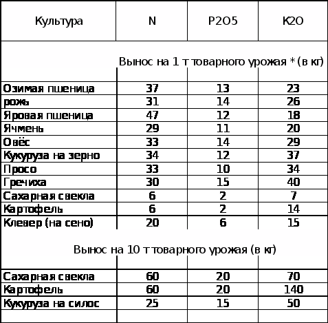 * Вынос приводится на 1 т товарного урожая зерна, сена и на 10т корне-клубнеплодов и силосной массы с соответствующим количеством нетоварной массы (соломы, ботвы и пр.). Данные по выносу могут значительно отклоняться от указанных средних величин.