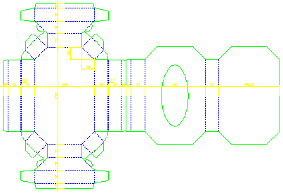 Важно разместить режущие ножи в области овала фаской внутрь, в сторону удаляемой части материала, используя ножи с односторонней заточкой, так как они позволяют более точно высекать сложный контур коробки. Для всех остальных контуров целесообразнее использовать ножи с двусторонней заточкой с прямолинейной фаской из-за более высоких эксплуатационных характеристик по сравнению с более дешевыми ножами с односторонней заточкой. Толщина ножей для картона m=305 г/квм составляет 0,71 мм, высота 23,8 мм.