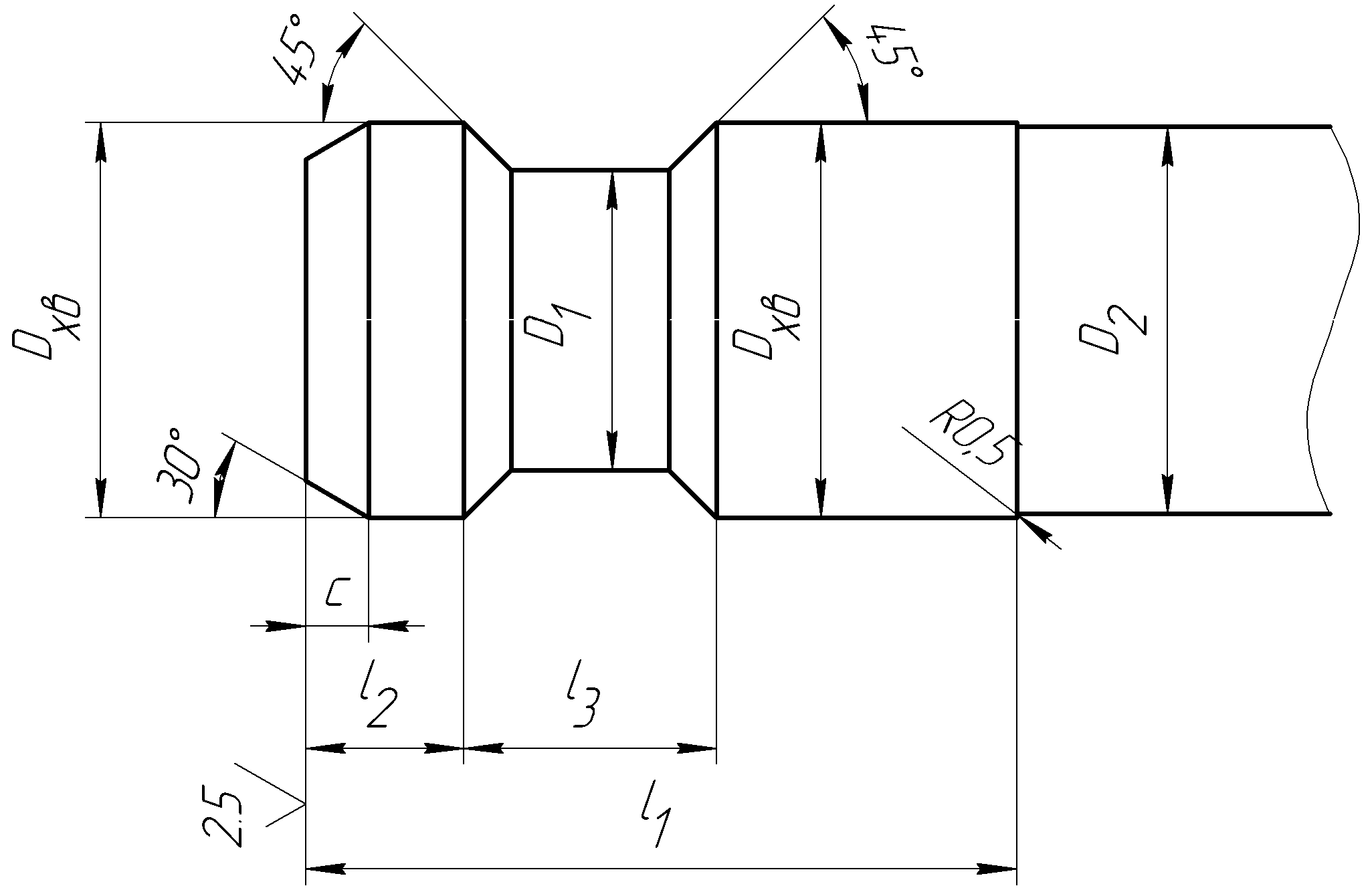 D>хв>=70 мм; D>1>=53 мм; D>2>=69 мм; l>1>=190 мм; l>2>=40 мм; l>3>=40 мм; c=1,5 мм; [σ>р>]= 300 МПа; F>хв>=2206,4 мм2.