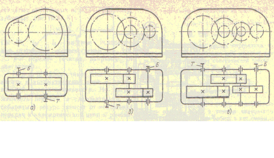 Трехступенчатые редукторы типа ЦЗУ и др. имеют развернутую схему расположения колес. Используются также трехступенчатые редукторы с раздвоенной второй ступенью.