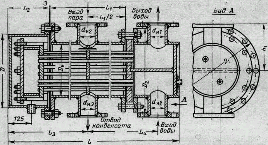 Необходимо произвести тепловой и конструктивный расчет отопительного пароводяного подогревателя горизонтального типа и секционного водоводяного подогревателя производительностью Q = 1,2∙106 ккал/ч. Температура нагреваемой воды при входе в подогреватель t>2>’ = 65°С и при выходе t>2>’’ = 95°С. Температура сетевой воды при входе в водоводяной подогреватель t>1>’ = 140°C и при выходе t>1>’’ = 80°C. Влияние загрязнения поверхности нагрева подогревателя и снижение коэффициента теплопередачи при низких температурах воды учесть понижающим коэффициентом =0,65.