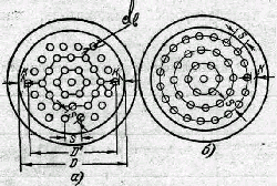 Здесь n’>1> – общее количество трубок, размещаемых на трубной доске по вершинам равносторонних треугольников ("ромбическое" размещение); n’>2> – общее количество трубок, размещаемых на трубной доске по концентрическим окружностям (Рисунок 1).