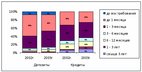 В области привлечения и размещения банковских ресурсов - это недостаточная диверсификация источников формирования ресурсов банков, несоответствие активов и пассивов по срокам, низкий удельный вес длинных пассивов (фактор, влияющий на инвестиционную активность) и др. Роль банковского сектора в кредитовании экономики ограничена в силу общей моакроэкономической нестабильности, что, в конечном счете, сказывается на недостаточной диверсификации пассивов, несоответствия по срокам привлечения ресурсов и их размещения в кредиты. Так, диаграмма (рис.1) показывает, что в ресурсной базе и структуре кредитных вложений банковской системы наблюдается несоответствия по срокам и по размерам. Данное обстоятельство является сдерживающим фактором развития инвестиционного и долгосрочного кредитования в республике. Однако в последнее время наблюдается положительная тенденция, роста удельного веса срочных депозитов.