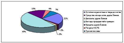 На 01.04.2004 пассивы формировались следующим образом (рис.2). Среди источников наиболее важным являются вклады (49%), вторым по важности являются остатки по текущим и расчетным счетам (21%), межбанковские кредиты занимают третью позицию (15%).