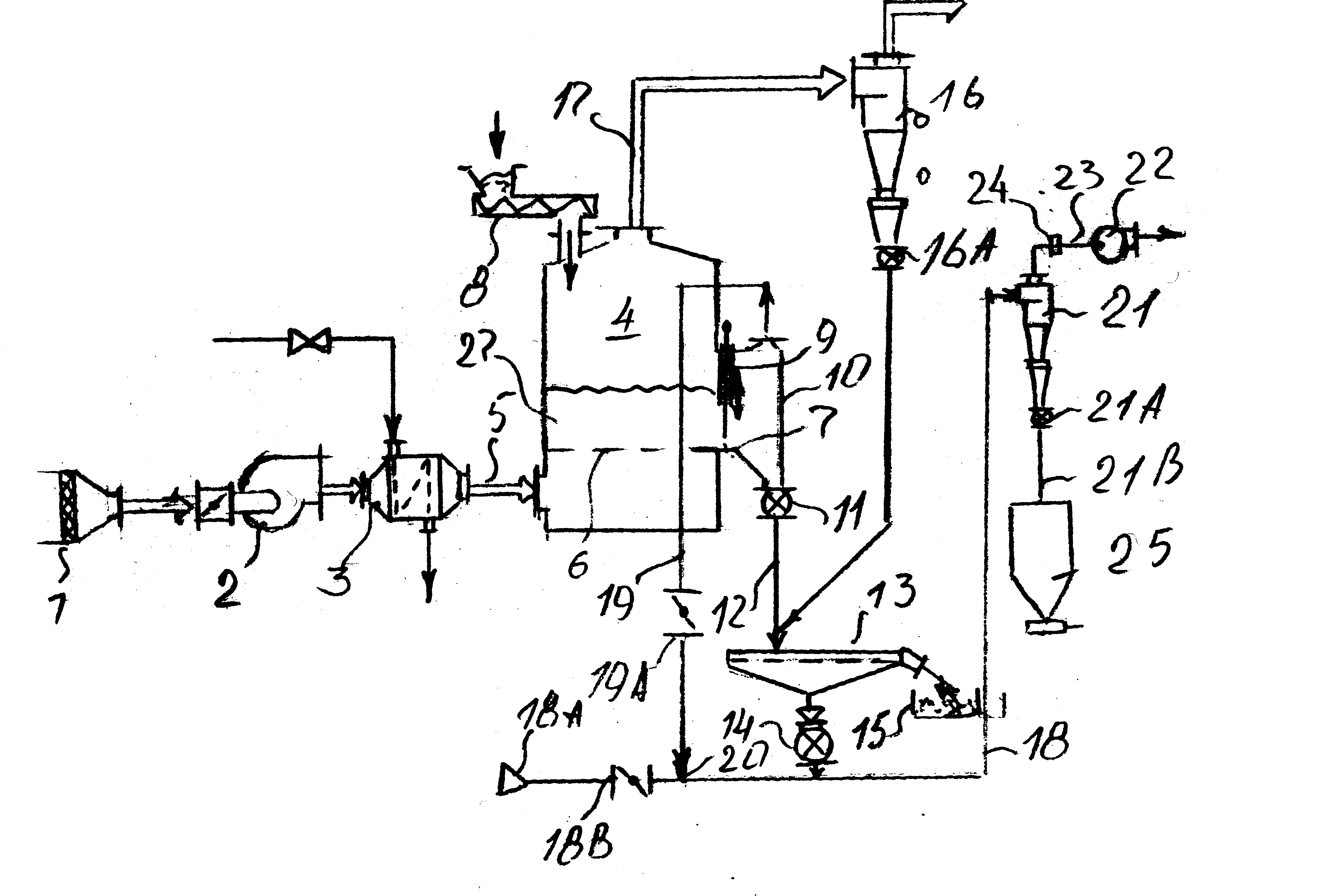 (57) Установка содержит печь 4 с кипящим слоем, внутри которой размещена газораспределительная пластина 6, а с боковой стороны сформировано окно 7 для выгрузки изделий. В печь из воздухопровода 5 вводится поток горячего воздуха и из питателя подаются исходные изделия. Из печи в циклон 13 через выпускной патрубок 14 вместе с отходящими газами выгружаются малыми порциями обработанные изделия. Изделия, выгруженные из циклона 13, подаются в пневматическую транспортировочную трубу 18 и по ней – в циклон 21, установленный отдельно от циклона 16.Установка отличается тем, что окно 7 и средняя точка трубы 18 соединены между собой посредством байпасной трубы 19 с заслонкой 19А. Внутри трубы 18 между точкой присоединения трубы 19 и отверстием для выпуска воздуха установлен клапан 18В для регулирования расхода воздуха.