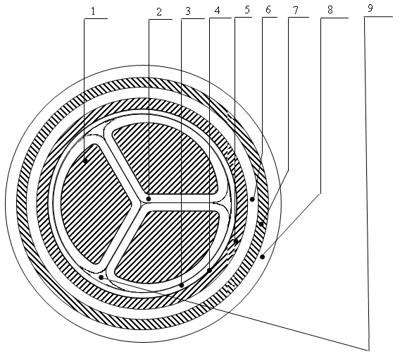 1 –– струмопровідна жила; 2 –– фазна ізоляція; 3 –– поясна ізоляція;