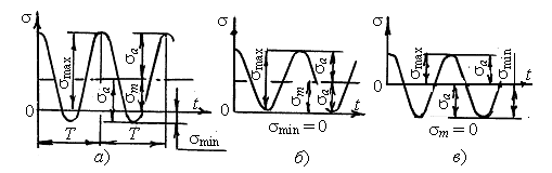 Если |>max>| = |>min>| и >max>> >> 0, а >min> < 0 (рис. 1.3, в), то R = –1, >m> = 0, >а> = >max> – цикл симметричный, самый опасный для прочности (>а> = >max>).