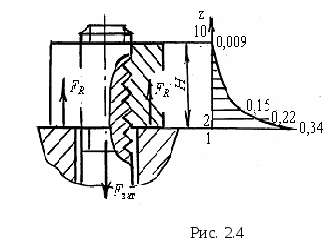 В случае общей схемы нагружения (рис. 2.8), кроме сдвигающей силы F>d>, на стык действуют еще отрывающие F>z>, M>x>, M>y>. Влияние моментов M>x> и M>y> не учитывают, поскольку (рис. 2.14) они не изменяют суммарной силы трения F>f>> >на стыке (компенсация: слева – F>f>, справа + F>f>). Отрывающая сила F>z> ослабляет давление и силу трения на стыке и требует увеличения затяжки. Сжимающая сила F>z> увеличивает силу трения. На ослабление или усиление стыка деталей расходуется часть внешней нагрузки (1 – ) F>z>.