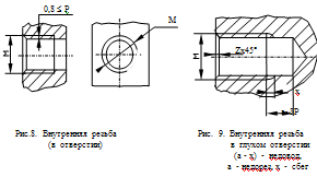 Внутренняя резьба - изображается в разрезах сплошной основной линией по внутреннему диаметру и тонкой сплошной линией по номинальному диаметру (рис.8).