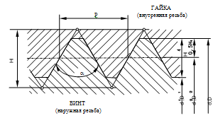Номинальный профиль резьбы отличается от основного введением зазоров (рис. 5). Номинальный профиль винта (наружной резьбы) определяется размерами: d>1>, d>2>, d>3>, h>3>, H>1> ; гайки (внутренней резьбы): D>1>, D>2>, D>4>, H>1>, H>4>.