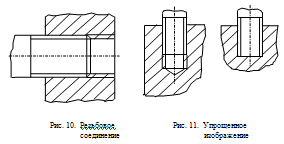 Резьбовое соединение. На разрезах резьбового соединения (рис. 10), в отверстии показывают только часть резьбы, которая не закрыта резьбой стержня ("преимущество" наружной резьбы).