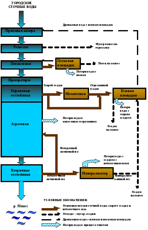 Существующая станция очистки стоков была построена в несколько этапов, последний из которых, в конце прошлого столетия, для очистки городских коммунальных и промышленных стоков. Номинальная производительность станции составляла 530000 м3/сут стоков. Большая часть стоков коммунального происхождения, доля промышленных стоков составляет 30%. В настоящей системе очистка стоков производится в два этапа. Сначала стоки проходят через решётки, песколовки и первичные отстойники, в качестве второго этапа осуществляется биологическая очистка с активным илом. После биологической очистки вода сбрасывается в реку Миасс. Осадки, образующиеся в процессе очистки стоков, размещаются на иловых площадках, расположенных на территории станции.