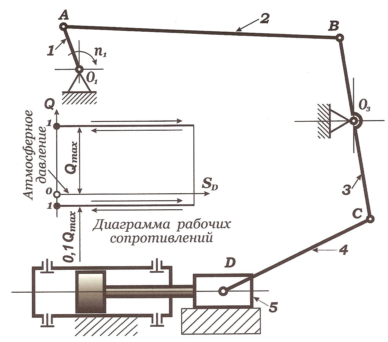 Насос предназначен для перекачивания жидкости под воздействием прямого и обратного ходов поршня 5, который приводится в движение шестизвенным кривошипно-коромысловым механизмом, состоящим из кривошипа 1, шатунов 2 и 4 и коромысла 3. Привод кривошипа 1 включает в себя электродвигатель и планетарный редуктор. Система смазки насоса снабжена плунжерным насосом, на основе кулачкового механизма, имеющего привод от электродвигателя через пару зубчатых колес (см. рис. 1.1).