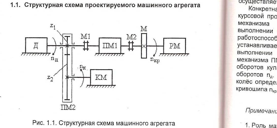 Вращение от двигателя Д через муфту М1 передается на ведущий вал передаточного механизма ПМ1 (планетарной передачи), который меняет частоту вращения Д n>Д>> >до заданной частоты вращения кривошипа n>кр>> >рабочей машины РМ. Ведомый вал ПМ1 соединяется с валом кривошипа РМ муфтой М2. Вращение от Д на вал кулачка кулачкового механизма КМ передается передаточным механизмом ПМ2, состоящим из зубчатых колес z>1> и z>2> и преобразующим n>д>> > в заданную частоту вращения кулачка n>к>. РМ выполнена на базе плоского рычажного механизма; плоский КМ состоит из вращающегося кулачка и толкателя.