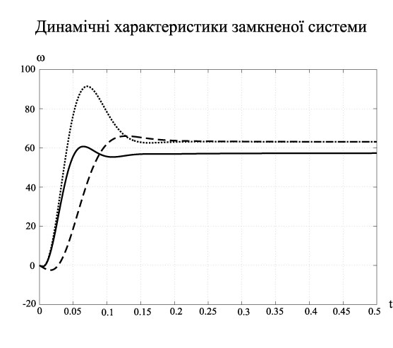 Настроювання на технічний оптимум характеризуються невеликим перерегулюванням 4,3%. Тривалість перехідного процесу визначається тільки малою некомпенсованою постійною часу і складає 4,7Т>μ>.