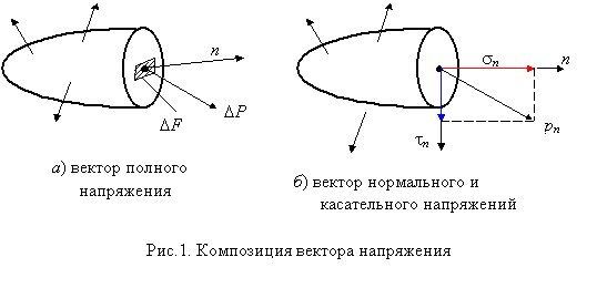 Мысленное разрезание бруса на две части произвольным сечением А (рис.1 a), приводит к условиям равновесия каждой из двух отсеченных частей (рис.1 б,в). Здесь {S'} и {S"}- внутренние усилия, возникающих соответственно в левой и правой отсеченных частях вследствие действия внешних усилий.