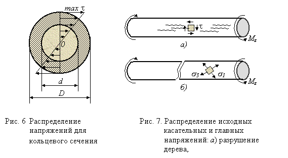 Как показали эксперименты и точное решение этой задачи в теории упругости, все гипотезы, сформулированные ранее для стержня со сплошным круговым сечением, остаются справедливыми и для стержня кольцевого поперечного сечения (рис. 6). Поэтому все выведенные ранее формулы пригодны для расчета стержня кольцевого сечения с той лишь разницей, что полярный момент инерции определяется как разность моментов инерции кругов с диаметрами D и d