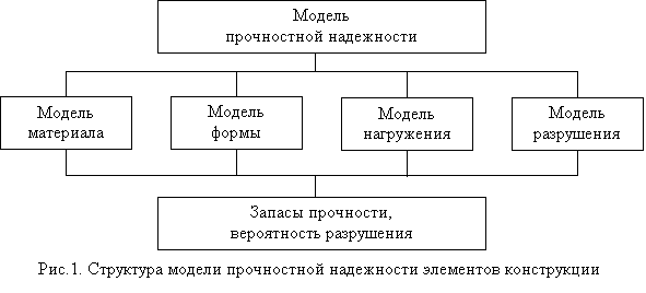 На рис.1 приведена структура модели прочностной надежности. Она включает известные модели или ограничения, которые априорно накладываются на свойства материалов, геометрию, формы изделия, способы нагружения, а также модель разрушения. Инженерные модели сплошной среды рассматривают материал как сплошное и однородное тело, наделенное свойством однородности структуры. Модель материала наделяется свойствами упругости, пластичности и ползучести.