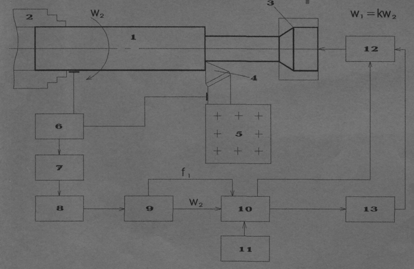 Предварительно деталь 1 устанавливается в патроне 2 передней бабки и зажимает ее. Второй конец детали 1, обращенный к задней бабке, зажимают в механизме 3 зажима. К детали 1 подводят резец 4 и настраивает его на требуемый размер. Включают привод главного движения станка, приводят во вращение деталь 1 и осуществляют резание, затем начинают обработку. Одновременно с блока 10 управления подают сигнал на механизм 12 натяжения детали 1 и предварительно нагружают ее начальной растягивающей силой для увеличение жесткости системы СПИД. В процессе обработки устройством 6 измеряют термо-ЭДС естественной термопары резец-деталь и с помощью блока 7 выделяют переменную составляющую термо-ЭДС, несущую информацию о вынужденных колебаниях системы деталь-резец. Так как глубина резания из-за малой жесткости детали является величиной переменной по диаметру детали и ее длине, то термо-ЭДС пропорциональна глубине резания, т.е. частота и амплитуда переменной составляющей термо-ЭДС пропорциональна частоте вращения детали и амплитуде относительных колебаний деталь-резец в зоне резания. Сигнал, пропорциональный переменной составляющей термо-ЭДС, усиливают в усилителе 8 и подают на фильтр 9, где выделяют сигналы f>1> и ω>2>, соответственно пропорциональные автоколебаниям и вынужденным колебаниям, и подают их на блок 10 управления. С задающего устройства в зависимости от размеров обрабатываемой детали и режимов обработки вводится коэффициент кратности вынужденных колебаний (имеющий четные значения 2, 4, 6… n). Сигнал с блока 10 управления поступает на механизм 13 импульсного изменения управляемой растягивающей силы, который воздействует с частотой ω>1>= kω>2>, кратной частоте вращения детали, на зажатый в механизме 3 конец детали. Импульсы управляемой растягивающей силы прикладывают в момент прохождения максимальной амплитуды биения детали через вершину резца и при повороте ее на угол, пропорциональный коэффициенту кратности частоты вынужденных колебаний детали, при этом вносят корректирующую поправку в относительное положение резца и детали при резании.