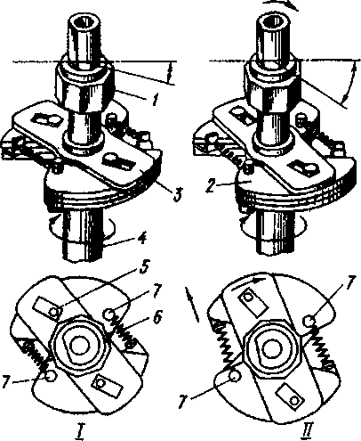 1 — кулачок; 2 — грузик; 3 — пластина кулачка; 4 — ведущий валик; 5 — штифт; 6 — пружина; 7 — ось грузика.