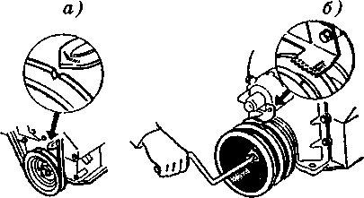 В двигателе автомобиля ЗИЛ-130 ВМТ такта сжатия определяется по совпадению отверстия на шкиве с меткой ВМТ на указателе датчика ограничителя числа оборотов (рис. 16 б). Затем нужно провернуть коленчатый вал против часовой стрелки так, чтобы отверстие в шкиве совпало с цифрой 9 на указателе.