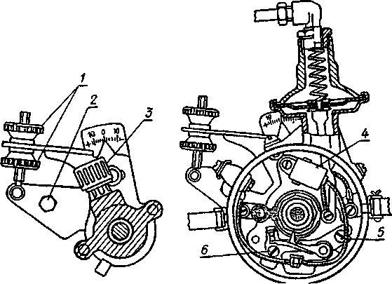 Закрепленный на блоке двигателя распределитель можно повернуть относительно валика с помощью регулировочных гаек. На нижней пластине имеются деления, а конец верхней пластины выполнен в виде стрелки. Каждое деление шкалы октан-корректора равно 2° поворота коленчатого вала.
