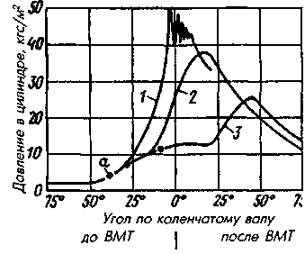 При позднем зажигании (малый угол опережения зажигания, кривая 3) горение смеси происходит после ВМТ, когда поршень идет уже вниз. Давление газов не сможет достигнуть необходимой величины, мощность и экономичность двигателя снижаются. Наблюдается перегрев двигателя, так как температура выхлопных газов повышается. Оптимальное протекание процесса сгорания рабочей смеси в цилиндре двигателя происходит в том случае, когда угол опережения зажигания соответствует кривой 2.