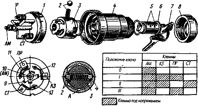 Рис. 13. Выключатель зажигания и стартера и схема соединения клемм