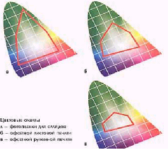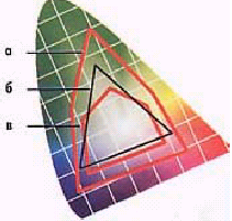 Рис. 2 Перекрытие цветовых пространств офсетной печати (в), монитора (б) и слайдовой фотопленки (а).