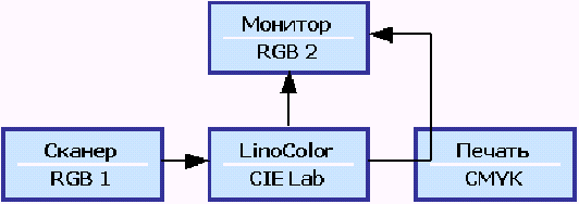 Одним из первых программных продуктов, использующих эту модель в качестве внутреннего цветового пространства, стал LinoColor 3.0 фирмы Linotype-Hell, предназначенный для сканирования и обработки изображений. Рассмотрим на примере этой программы принципиальную схему использования пространства CIELab в качестве внутреннего пространства, считающуюся в настоящее время классической. Программа LinoColor получает RGB-данные со сканера и трансформирует их в пространство CIELab. Для представления на экране монитора Lino-Color трансформирует CIELab в пространство монитора RGB. Для вывода на фотонаборный автомат или цифровую цветопробу выполняется трансформация в пространство CMYK печатного процесса (рис.4).