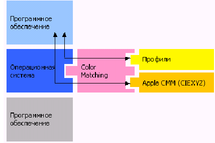 Несомненно, что самым большим прорывом в возможности управления цветом стала система ColorSync фирмы Apple (или Color Matching Methods (CMM) - методы цветового согласования, как их называет сама фирма). ColorSync работает на уровне операционной системы, что означает поддержку управления цветом для всех программ независимо от того, ориентированы они на работу с растровой либо векторной графикой или на верстку. Система предусматривает присутствие так называемого Plug-In port (порта для самонастраиваемых модулей), предназначенного для профилей устройств. По терминологии Apple профиль (profile) - это файл, описывающий цветовые характеристики устройства, к которому при работе обращается та или иная программа для корректного отображения того или иного изображения. С помощью ColorSync обеспечивается цветовая трансформация для всех устройств. Например, программа может запросить выполнить процедуру трансформации цветов, полученных на сканере “а”, в цвета монитора “b” и наконец в цвета принтера “с”.