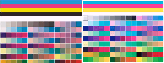 Рис. 11. Виды тестовых таблиц, используемых для профилирования печатных устройств: слева - CMYK, справа - CMY.
