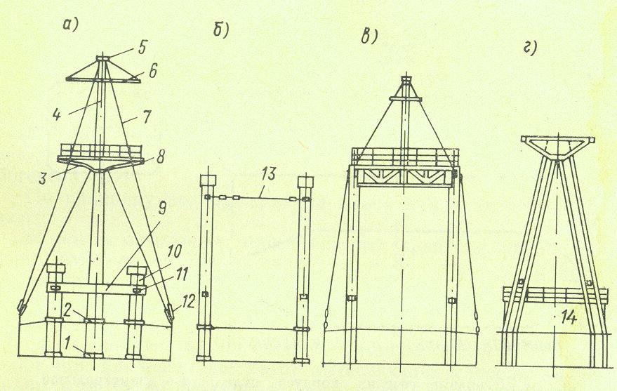 На рисунке 1 показаны основные типы грузовых мачт: а) одиночная вантовая; б)парные грузовые колонны; в)П-образная; г)Л-образная.