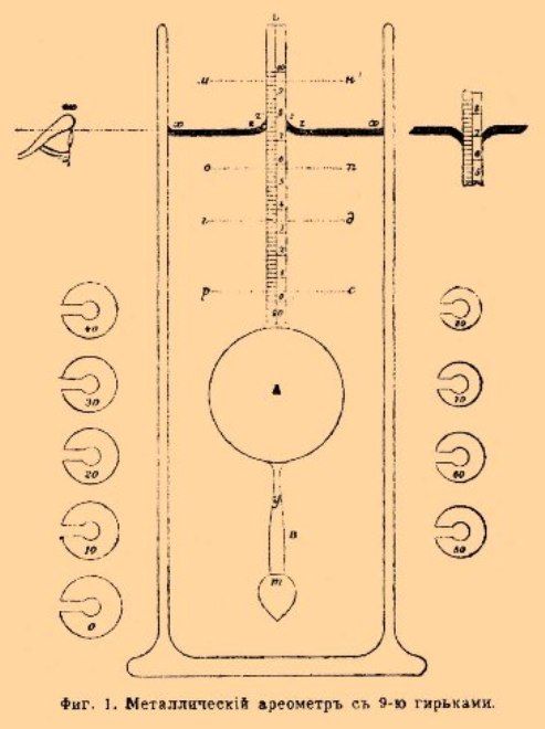 Определение крепости спирта металлическим спиртомером производится следующим образом. Пусть спиртомер без гирек погрузится в спирте до черты on, так что в жидкости будет находиться 5 4/>5> = 5,8 делений шкалы. К этому числу прибавляют число 90, находящееся на спиртомере, и получают 95,8, которое и есть искомая крепость (видимая); то же делают, если спиртомер опустится и до другого уровня шкалы. Если спиртомер, опущенный в жидкость, плавает так, что вся шкала высовывается из жидкости, то на него надевают одну гирьку, выбирая такую, чтобы спиртомер погрузился до какой-либо черты шкалы. Пусть была взята гирька с номером 50 и спиртомер погрузился до черты pc, т. е. до деления 0,4; чтобы найти крепость спирта надо прибавить к найденному показанию шкалы номер гирьки: 50 + 0,4 = 50,4. К спиртомеру прилагается стакан и термометр; гирьки одного спиртомера не могут употребляться при другом. Как стакан, так и спиртомер должны содержаться в чистоте; на грязном спиртомере быстро портится позолота; кроме того, мениск жидкости у шкалы вместо нормальной формы (p) принимает неправильный вид; вытирать спиртомер нужно осторожно, чистой тряпкой, чтобы не помять его. К металлическому спиртомеру прилагаются таблицы, в которых находят истинную крепость спирта тем же путем, как это указано для обыкновенного спиртомера.
