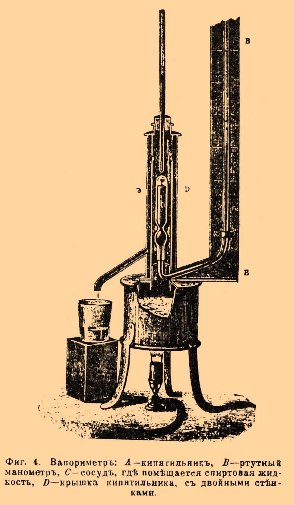 III. Подобно тому как меняется удельный вес и температура кипения спиртовых растворов в зависимости от процентного содержания в них алкоголя, также меняется и упругость паров их при какой-либо температуре: чем больше процентное содержание алкоголя, тем упругость паров больше в сравнении с упругостью паров чистой воды. На этом основании устроен особый прибор, который называется вапориметром (Рис. 4).