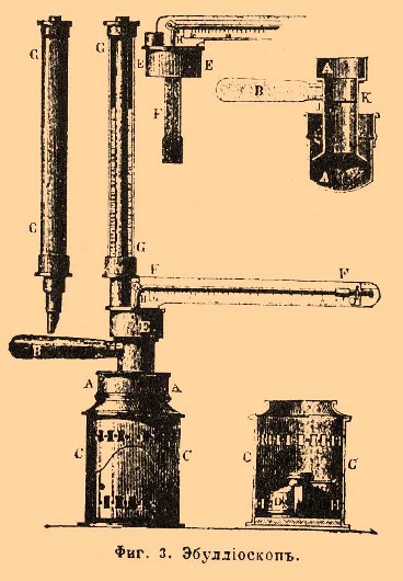 Опыт производится следующим образом. В котелок A наливают чистой воды до черты JK, закрывают крышкой и нагревают до кипения, не вставляя холодильника G; 0° шкалы устанавливается там, где остановилась вершина ртутного столбика термометра. Воду из котелка удаляют, его ополаскивают исследуемой жидкостью, которую затем наливают до черты JK, ставят на место холодильник G и жидкость нагревают до кипения. Тот пункт на шкале, против которого остановится вершина ртутной нити термометра, и будет искомый процент алкоголя. Шкала термометра иногда имеет два рода делений: одни для спирта, а другие для вина, так как присутствие растворимых веществ вообще влияет на температуру кипения жидкостей. В других эбуллиоскопах (например, Маллиганда) жидкость нагревается не прямо на голом огне, чем устраняется перегревание. Эбуллиоскоп Видаль-Маллиганда подвергался испытанию в комиссии парижской академии, с 14 сортами различных вин, в которых содержание алкоголя менялось от 7° до 17°. Комиссия пришла к тому выводу, что в нормально бродивших винах экстрактивные вещества не влияют на показания эбуллиоскопа, так как одни из них повышают его показания, другие же понижают; при исследовании сладких вин и ликеров, их нужно разбавлять равным или двойным объемом воды; ошибка в определении не превышает 1/6%, в большинстве же случаев не более 1/20%. По Грисмайеру, эбуллиоскоп может с успехом быть применен для определения содержания алкоголя в пиве.