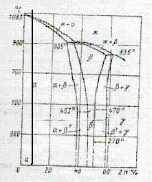 Рисунок 6.2 Диаграмма состояния медь-цинк (отмечена латунь с содержанием цинка 9 %)
