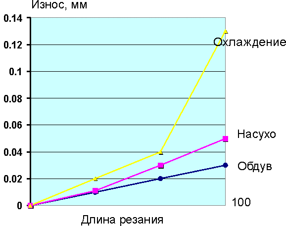 Интересный эффект увеличения стойкости инструмента при ВСО наблюдается при сравнении способов охлаждения. Как показывает график, наибольшая стойкость наблюдается при использовании обдува. Так как тепло концентрируется в стружке, ее надо просто быстро удалить из зоны резания. Низкая стойкость инструмента при охлаждении объясняют главным образом выкрашиванием, вследствие циклических термических нагрузок на режущую кромку инструмента. Постоянная тепловая нагрузка, даже на относительно высоких температурах лучше, чем меняющаяся циклическая нагрузка. Все что мы перечислили выше, относится к технической стороне ВСО.