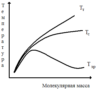 Температура хрупкости, как и Т>с>, зависит от молекулярной массы (рис. 10). При малой молекулярной массе, когда мы имеем дело с олигомером, значения Т>с> и Т>хр> совпадают. Когда молекулы становятся достаточно длинными и, следовательно, появляется гибкость, Т>с> растет быстрее, чем Т>хр> и возникает температурный интервал вынужденной эластичности (Т>с>—Т>хр> ) При дальнейшем росте молекулярной массы Т>хр> даже несколько