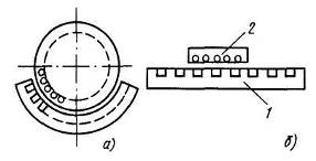 Мал. 3. Модифікація конструктивного виконання електричних машин: а - машина із сегментним статором; б - лінійний двигун; 1 - статор; 2 - ротор